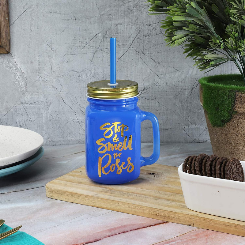 The Decor Lane Blue Color Mason Jar With Lid And Reusable Straw – 500 ml